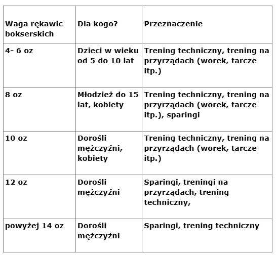 Natürlich ist die obige Tabelle nur ein Vorschlag und es wird nichts passieren, wenn wir mit 16 oz Handschuhen an Geräten trainieren, aber normalerweise werden leichtere Handschuhe für das Training an Geräten und schwerere Handschuhe (die eine bessere Polsterung und Sicherheit für den Partner bieten) für das Sparring verwendet.