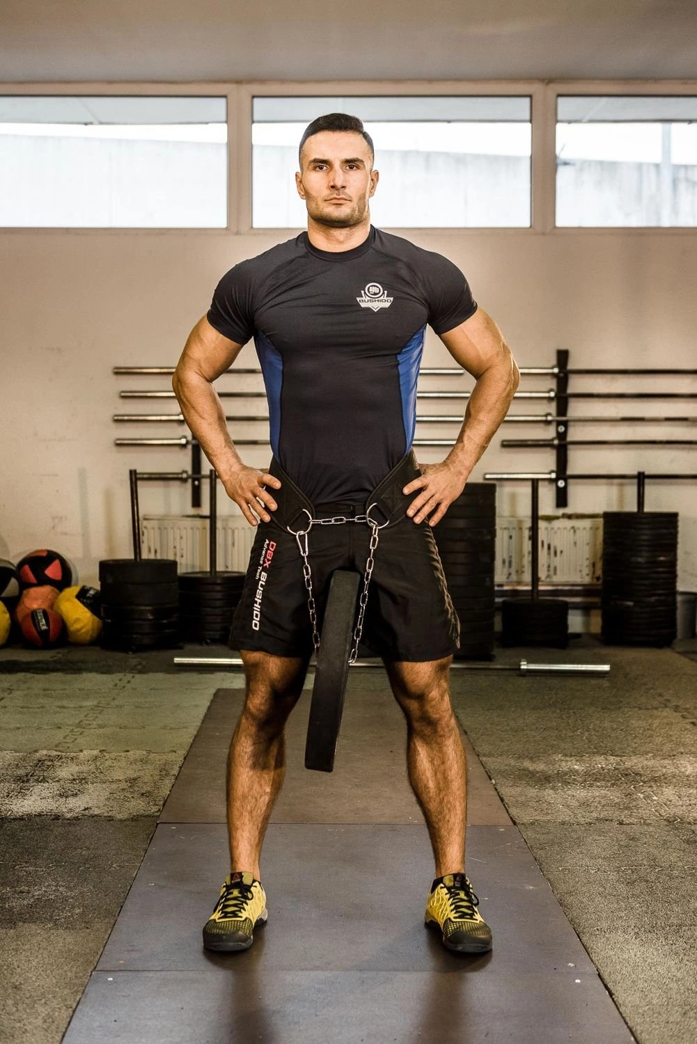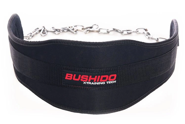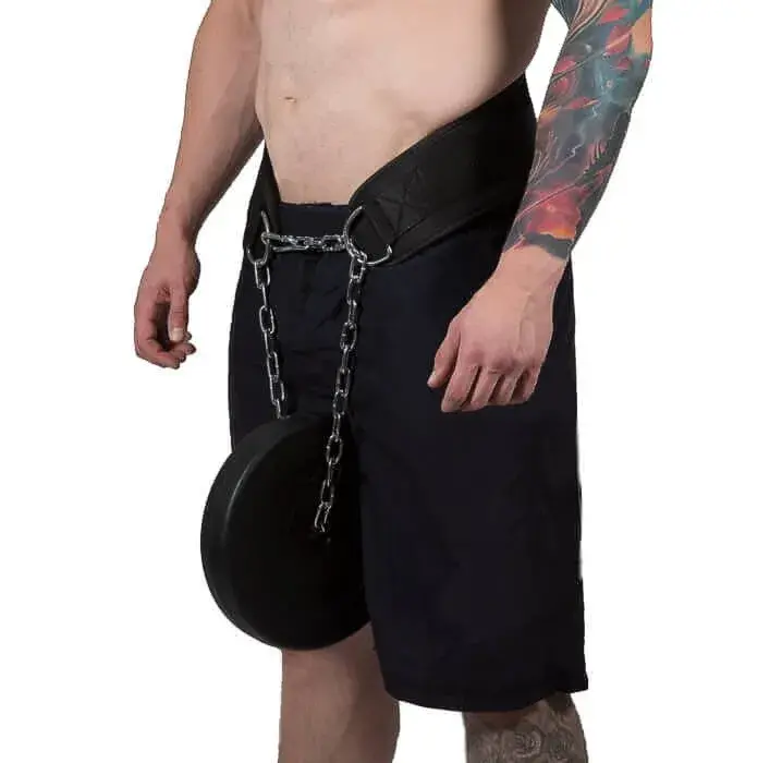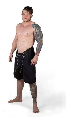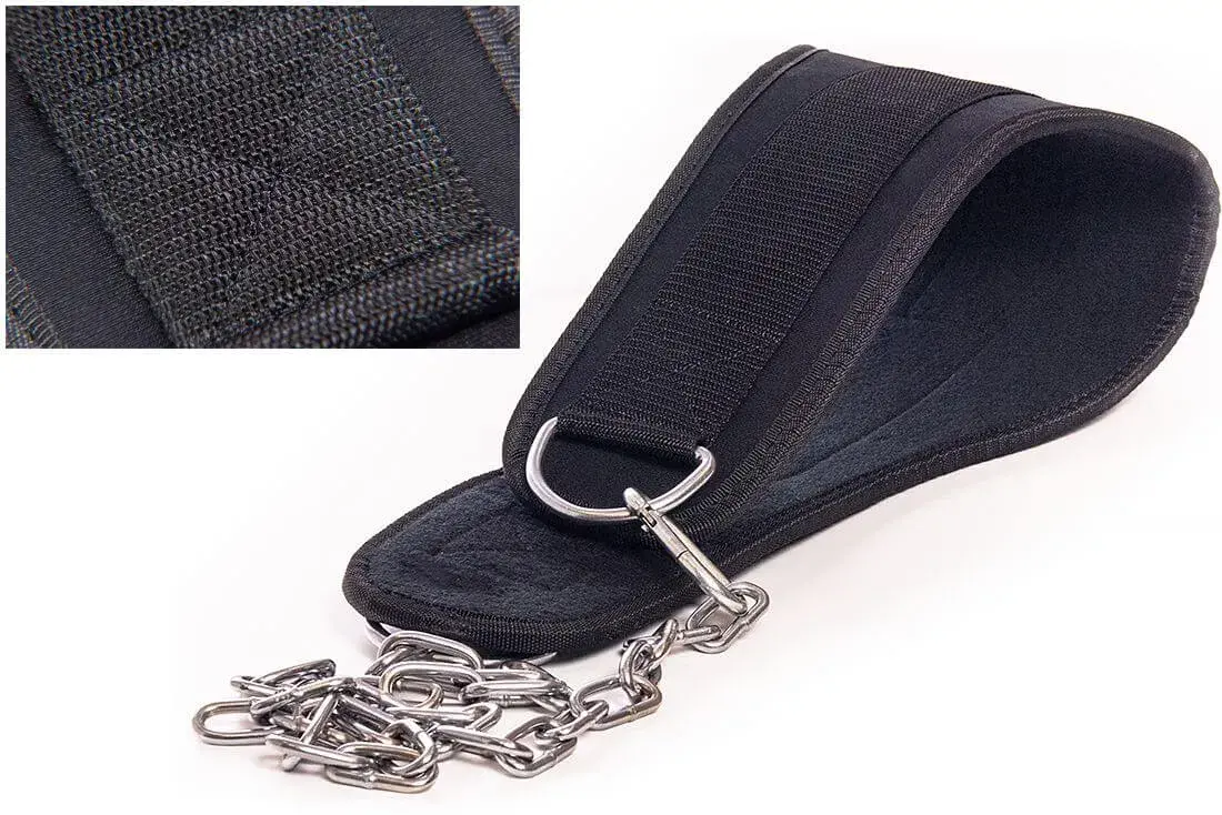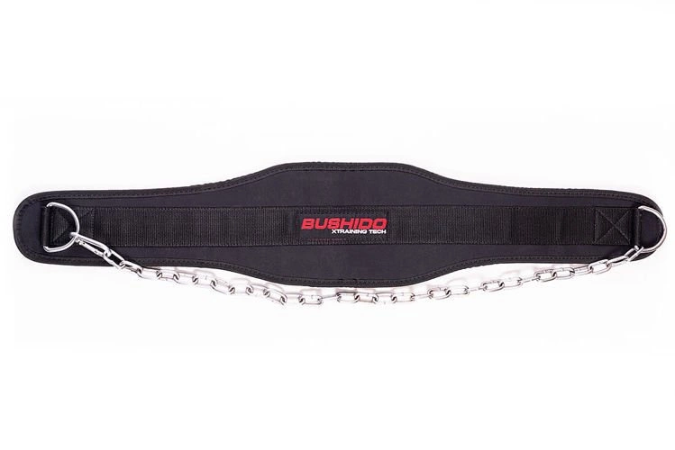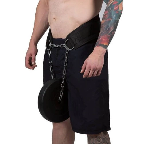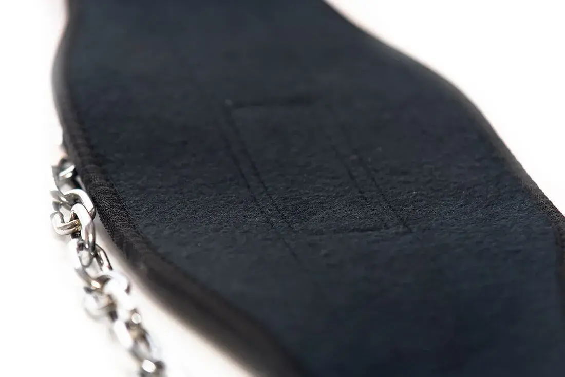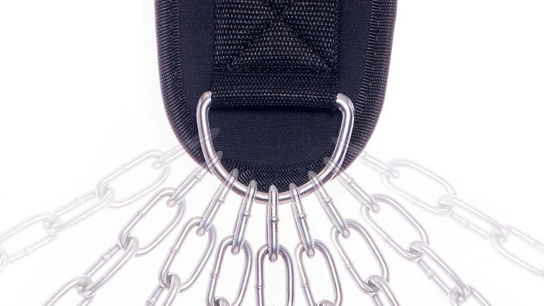 Um ein hohes Maß an Sicherheit zu gewährleisten, verwendet der Gurt eine kurzgliedrige, geschweißte Kette, die auch beim Training mit sehr schweren Lasten ein hohes Maß an Sicherheit gewährleistet. Dank der Verwendung von kurzen Gliedern verheddert sich die Kette nicht und läuft gut über jeden Krümmungsradius.