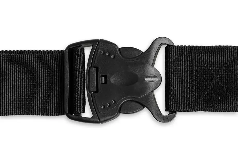 Der Gurt wird an der Vorderseite mit einer bequemen und robusten Schnalle mit einem Verriegelungssystem befestigt, das ein versehentliches Öffnen verhindert