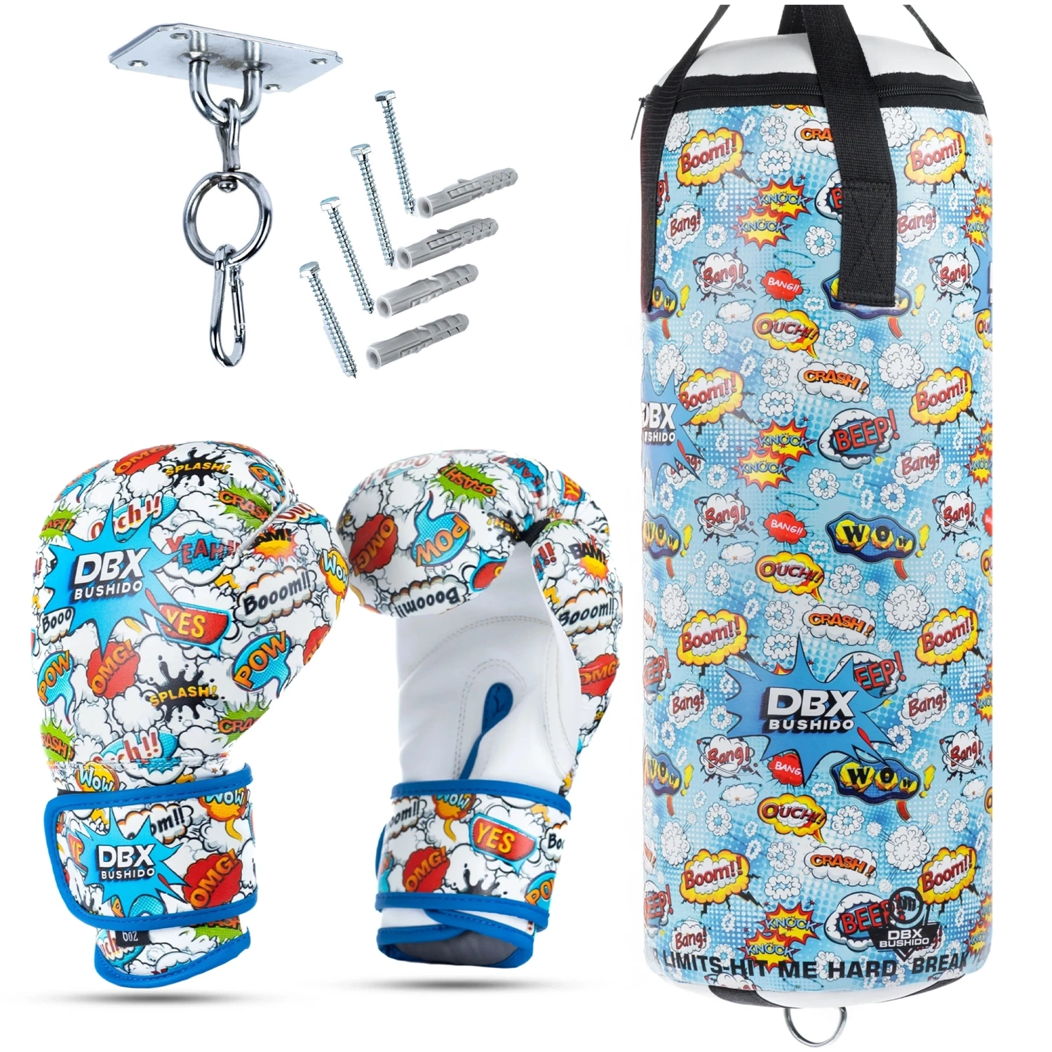 Das Cartoon Blue Boxset ist ein komplettes Trainingsset für Kinder bis 12 Jahre, das einen sicheren Einstieg in den Kampfsport zu Hause oder im Studio ermöglicht. Das Set besteht aus einem leeren Boxsack zum Selbstbefüllen, 6-Unzen-Boxhandschuhen und einer Deckenhalterung mit Dübel-Set.
